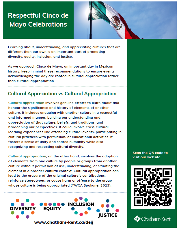 Learning about and appreciating cultures different from our own helps us promote understanding and respect for each other. As Cinco de Mayo approaches, we recognize it as an important day in Mexican history. Any activities or events connected to this day should focus on respect and appreciation.To learn more about the meaning of Cinco de Mayo and how to honour it respectfully, please visit the full document on our Let’s Talk page.