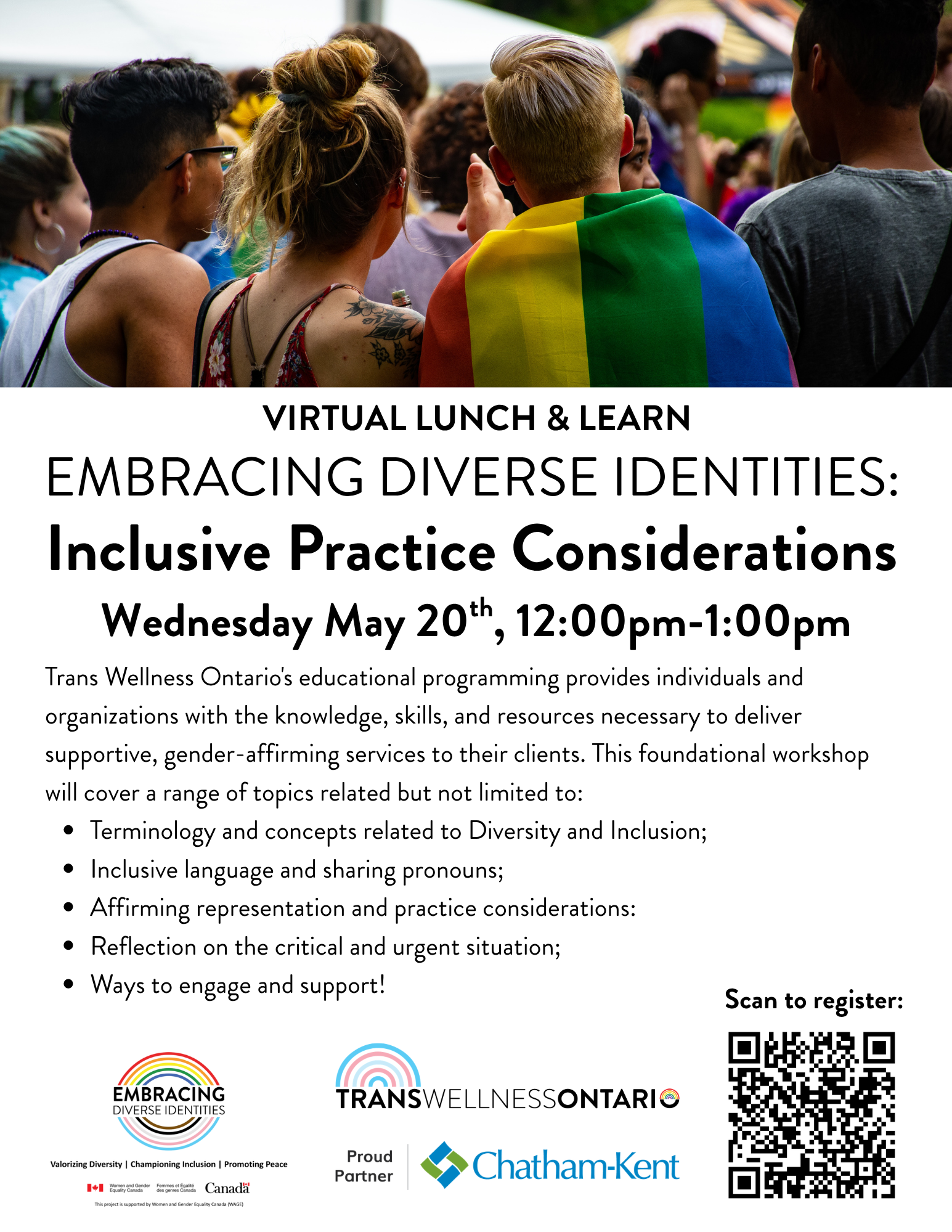 Wednesday May 20, 12:00 - 1:00 PM, Embracing Diverse Identities: Inclusive Practice ConsiderationsThis workshop builds on the first and will cover a wide range of topics related but not limited to: