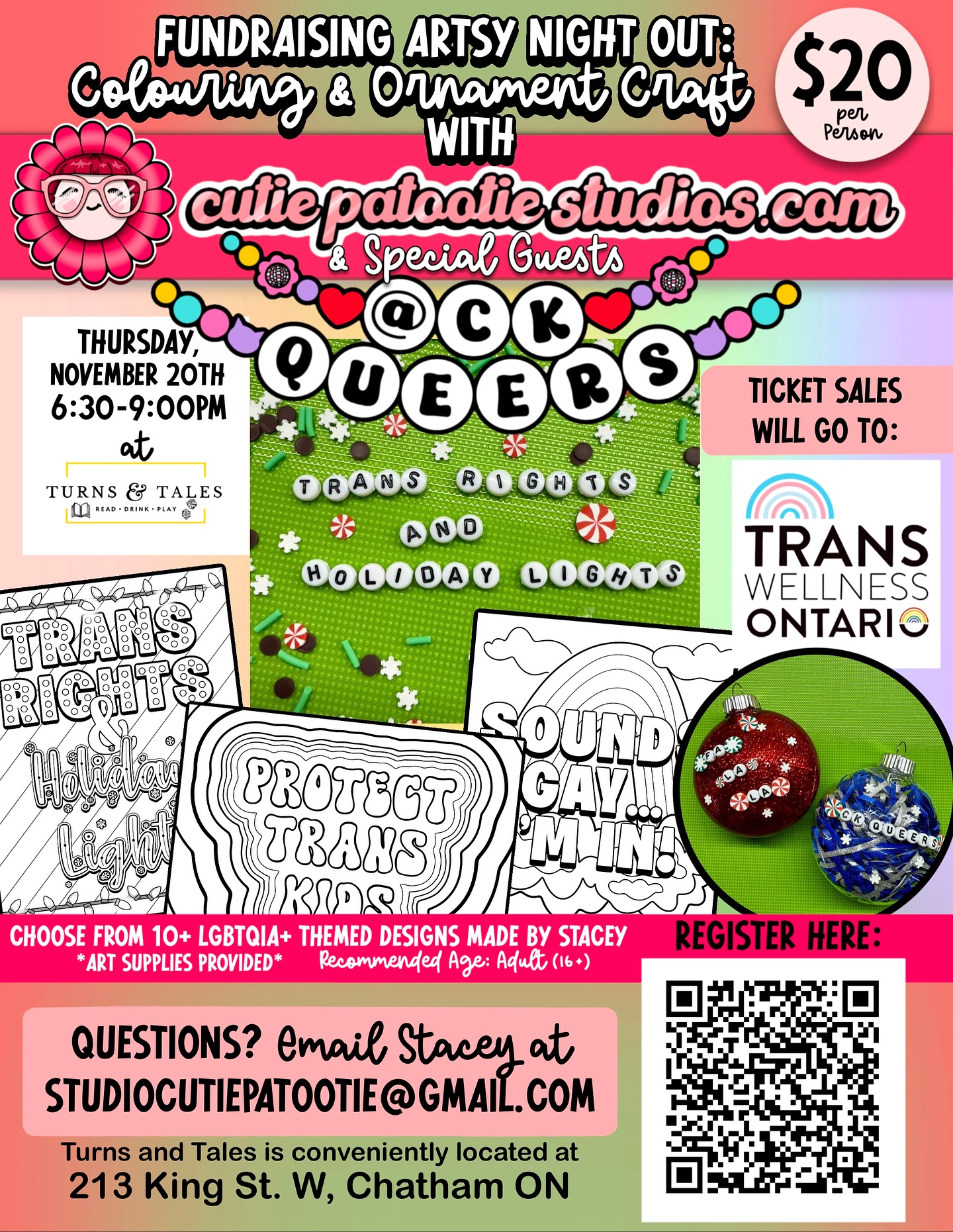 A partnership between Cutie Patootie Studios and CK Queers. A gentle and cozy evening of creativity, connection, and community in support of Trans Wellness Ontario. Work on a specially-themed colouring page and/or decorate your own friendship holiday ornament for $20. All proceeds go directly to Trans Wellness Ontario. -