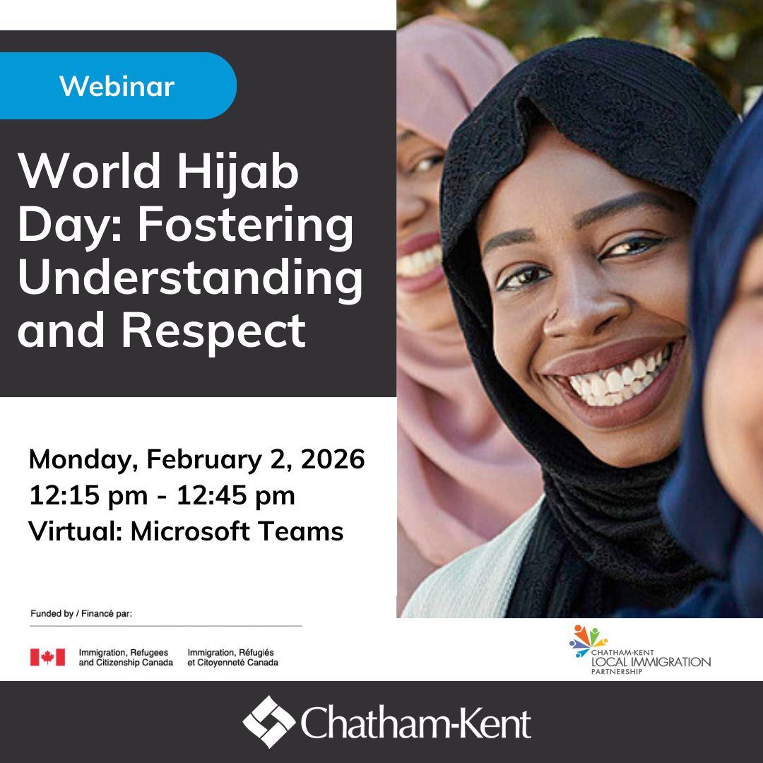 Join us for an engaging Lunch & Learn in honour of World Hijab Day. This short webinar will explore the significance of head coverings worn by Muslim women, the diversity of styles, and common questions and misconceptions. Deepen your understanding, ask questions, and help make Chatham‑Kent a respectful and inclusive place for everyone.